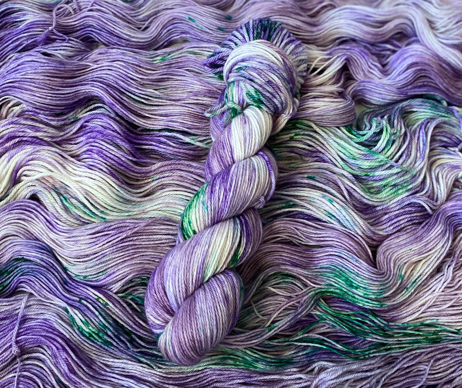 Artistic play on words. Shades of purple and hints of green meet for this one of a kind yarn experience.